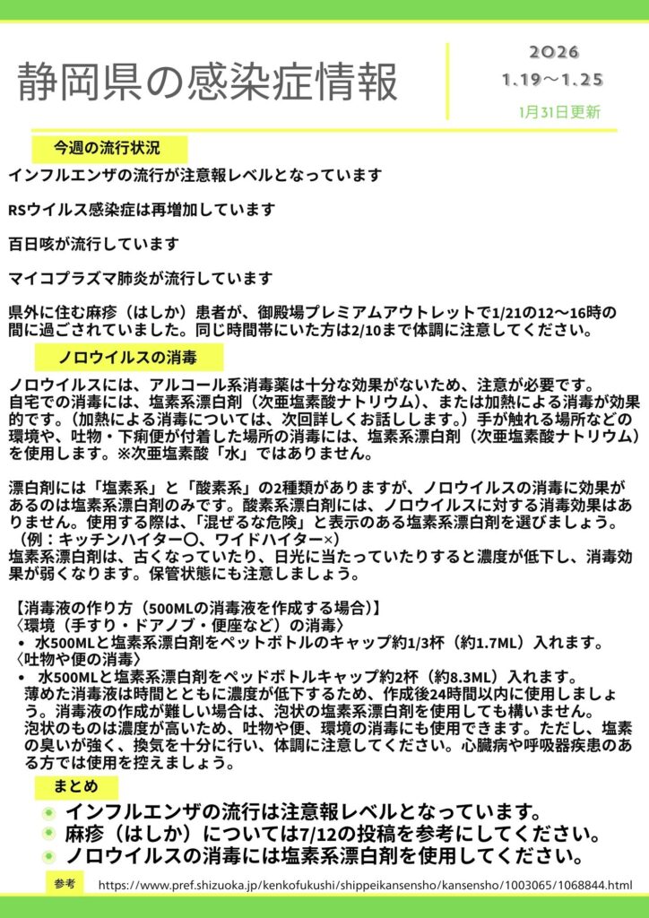 静岡県の感染症情報(1/31)・ノロウイルスの消毒