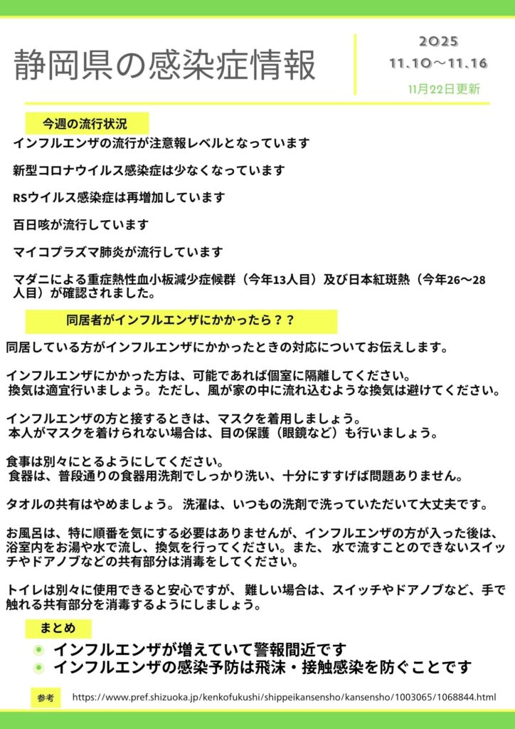 静岡県の感染症情報(11/22)・同居者へのインフルエンザ対応