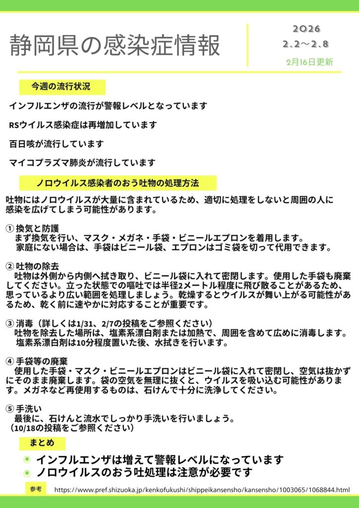 静岡県の感染症情報(2/16)・ノロウイルス吐物処理方法